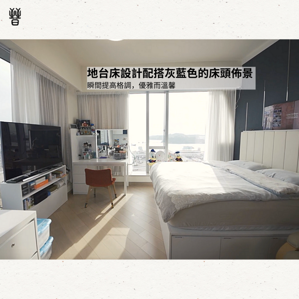 -地台床設計🛏️ 配搭灰藍色的床頭木製衣櫃,瞬間提高格調