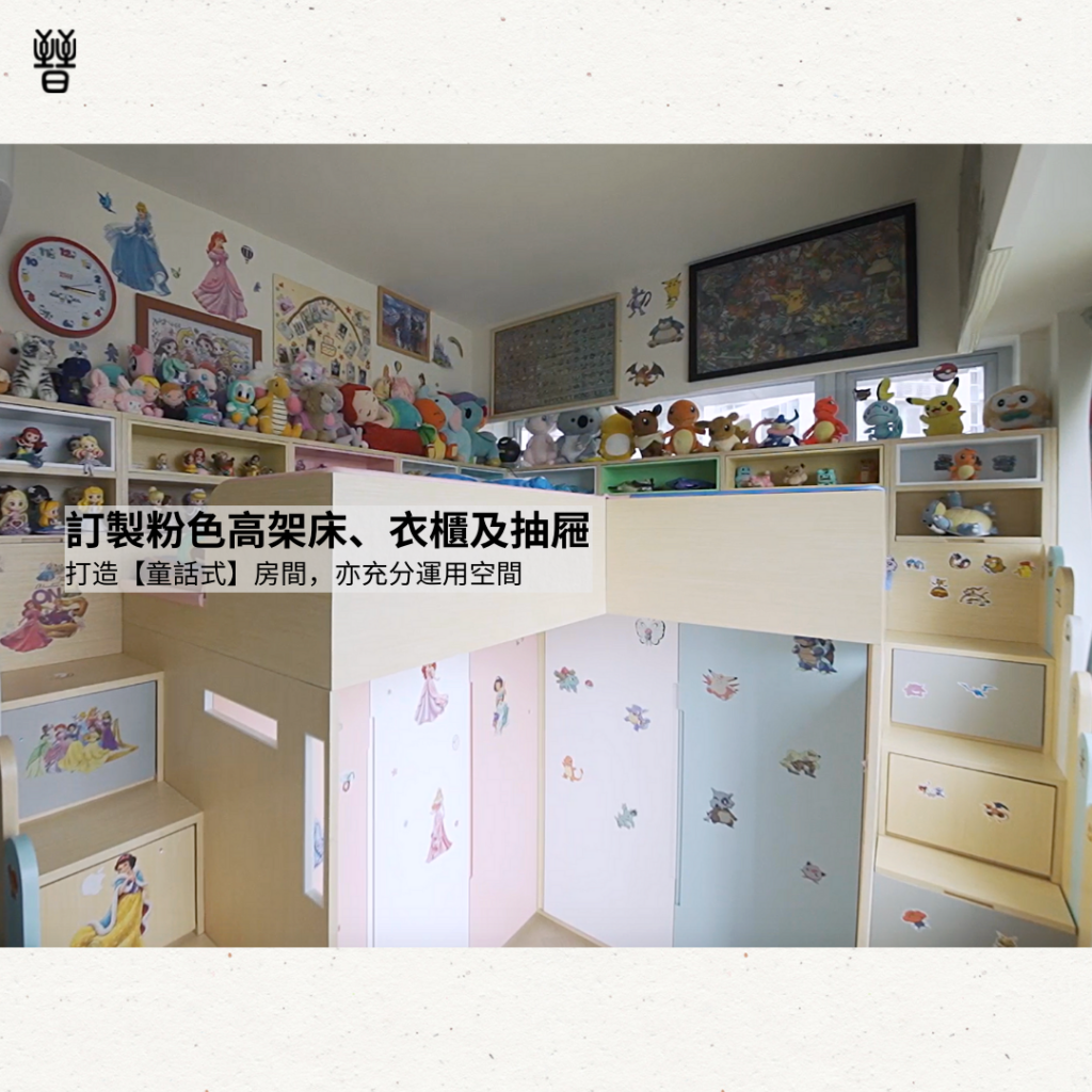 -床上沿牆身位置訂造木櫃,讓孩子有足夠空間放置玩具及公仔🎮🧸