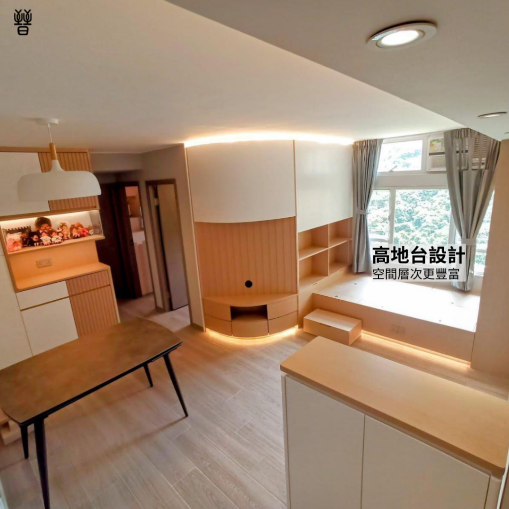 沙田康林苑景林閣三房單位。客廳靠窗的位置以高地台設計,提供舒適休閒的娛樂空間,高低落差感讓空間層次更豐富。大型的弧形電視櫃代替牆磚分隔客廳及BB房,原本牆身的厚度改變成儲物空間。