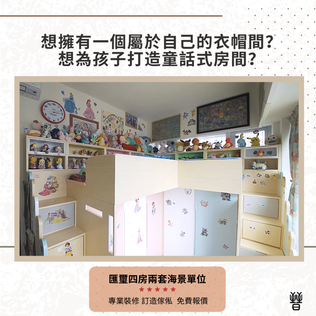 匯璽四房兩套海景單位設計與裝修。主人房特色:巧妙運用空間佈局,以特製衣櫃依靠床頭,打造出半開放式衣帽間。臥眠區自成一格但又與衣帽間保持連貫的動線。小朋友房間特色:粉色高架床設計,打造【童話式】房間。床架下為訂造的衣櫃及置物櫃,床上沿牆身位置訂造木櫃,讓孩子有足夠空間放置玩具及公仔。