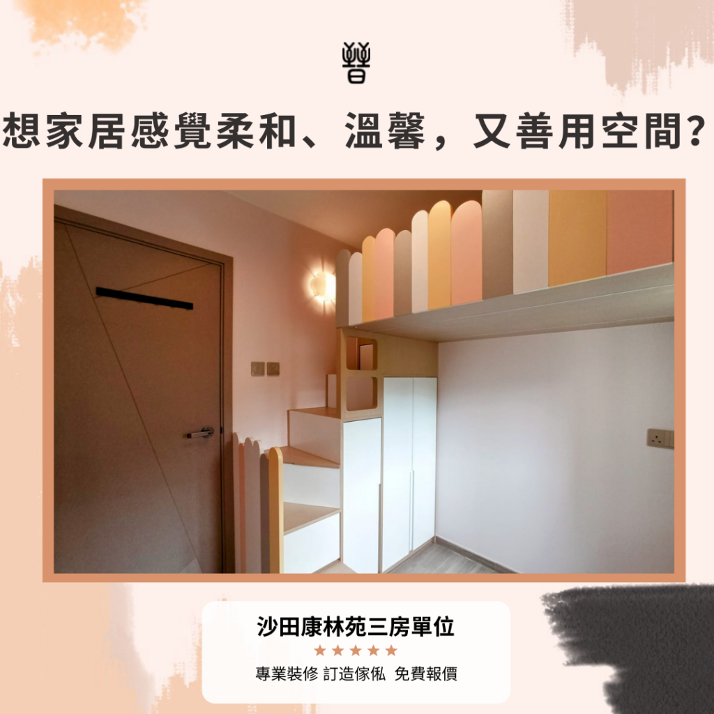 沙田康林苑景林閣三房單位。客廳特色:客廳靠窗的位置以高地台設計,提供舒適休閒的娛樂空間,高低落差感讓空間層次更豐富。大型的弧形電視櫃代替牆磚分隔客廳及BB房,原本牆身的厚度改變成儲物空間。