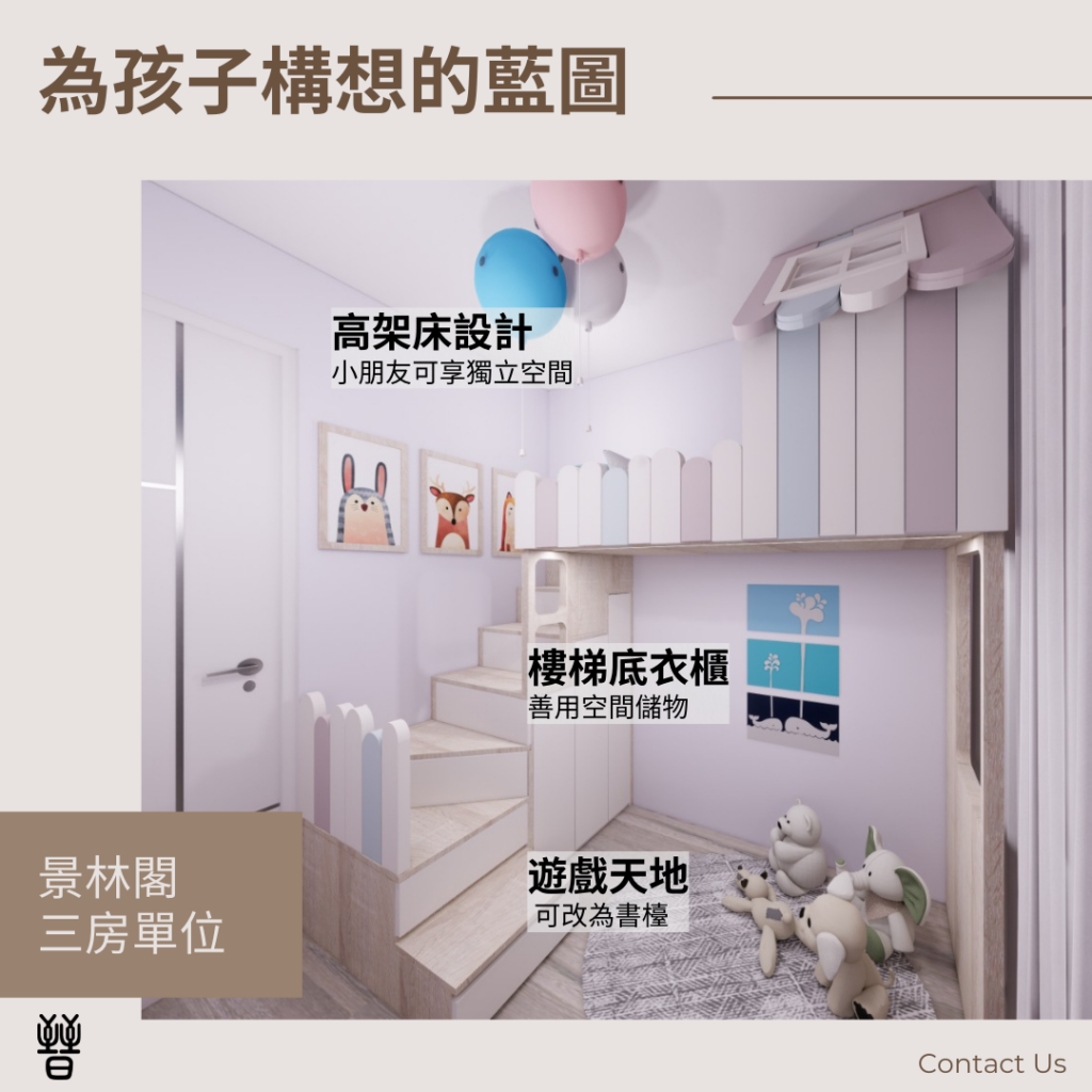 項目:沙田康林苑景林閣三房單位,圖中房間面積:約100呎。高架床設計,床架下為訂造的衣櫃及置物櫃,保留空間作小朋友的遊戲天地,粉色系的牆身及傢俬,不失童真。設計師充分運用空間 ,集睡眠、玩樂、儲物於一室。
